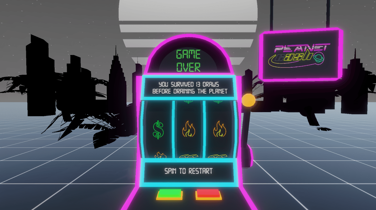 Players earn money by spinning slot-machine wheels and reinvest their gains either to boost industrial efficiency or to restore ecological resources, creating a constant risk–reward balance between profit and planetary survival.
